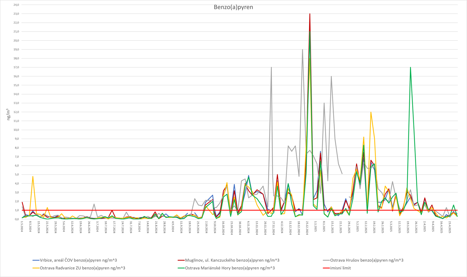 Data kontinuálního ročního imisního monitoringu mimo jiné potvrzují, že halda není momentálně významným zdrojem znečištění ani v případě PAU. Znečištění ovzduší benzo[a]pyrenem je plošným dlouhodobým problémem nejenom průmyslové Ostravy, a i když se situace v posledních letech zlepšuje, stále dochází k překračování ročního imisního limitu (1 ng/m3). Ke zvýšeným hodnotám benzo[a]pyrenu dochází především v topné sezoně. Naměřené hodnoty benzo[a]pyrenu jak na haldě, tak v jejím okolí a ve zbytku Ostravy jsou si jednotkově velmi podobné, což dokládá následující graf: