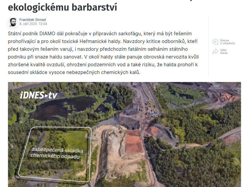 Státní podnik DIAMO dál pokračuje v přípravách sarkofágu, který má být řešením prohořívající a pro okolí toxické heřmanické haldy. Navzdory kritice odborníků, kteří před takovým řešením varují, i navzdory předchozím fatálním selháním státního podniku při snaze haldu sanovat. V okolí haldy stále panuje obrovská nervozita kvůli zhoršené kvalitě ovzduší, ohrožení podzemních vod a také riziku, že halda prohoří k sousední skládce vysoce nebezpečných chemických kalů.